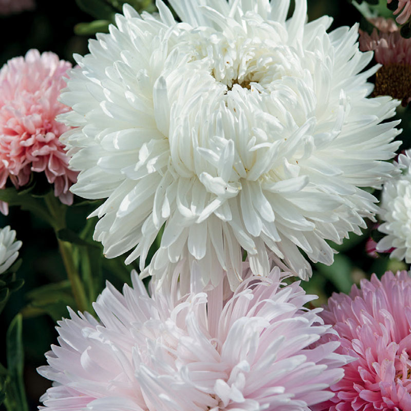 Söt blandning av dubbla blommor i olika storlekar, i färger som aprikos, rosa och vitt. Hållbar som snitt och fin i rabatt.