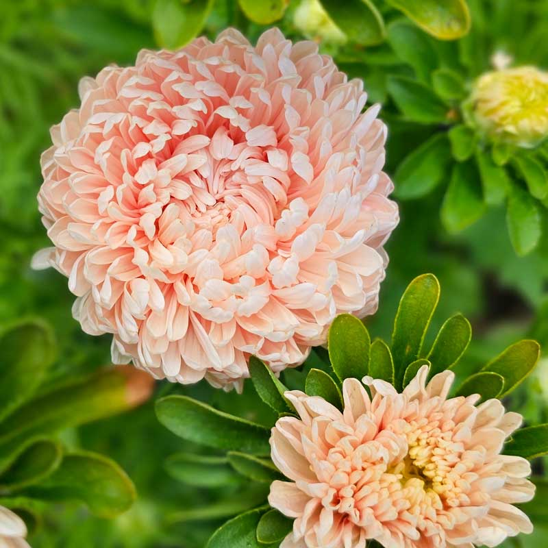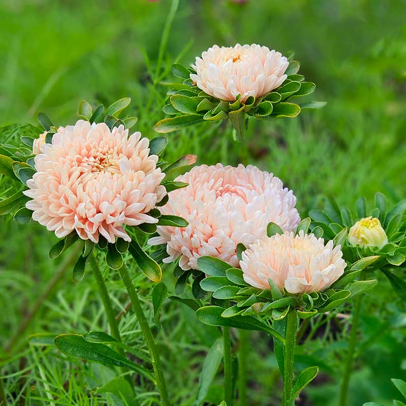 Underbar sommaraster i mjukt laxrosa. Perfekt dubbel och pionblommande. Utmärkt för rabatt och snitt.