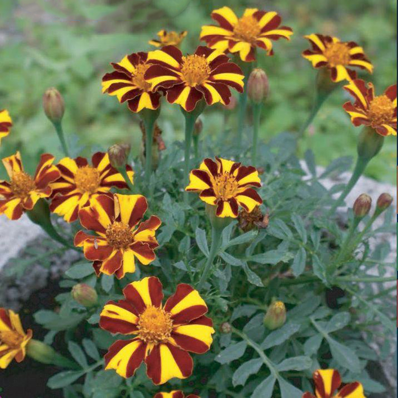 Denna tagetes har ett mycket speciellt utseende med sina randiga kronblad, som sitter i en enkel krans. I ogynnsamt väder blir kronbladen enfärgat mörkt brunröda. Plocka bort vissnade blommor, så utvecklas nya blommor bättre.
