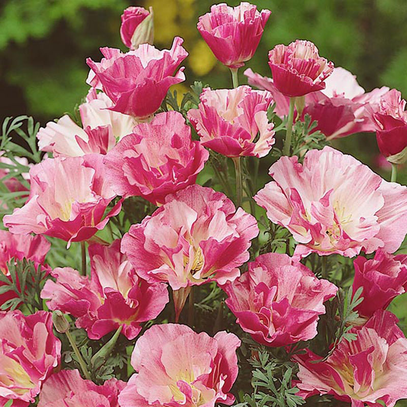 'Appleblossom Pink' ger ljusa rosenrosa fransiga blommor över ett snyggt grönt bladverk.