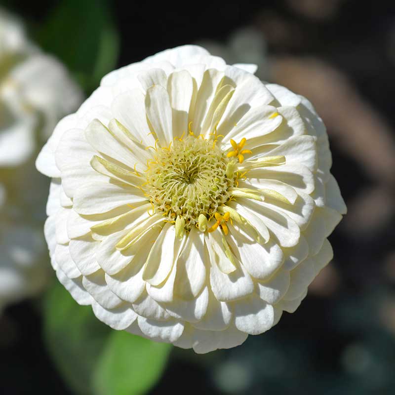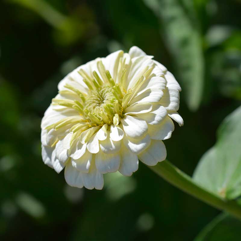 En vit dahlia-liknande Zinnia med halv- och helfyllda blommor. Fin i rabatt och i buketter.