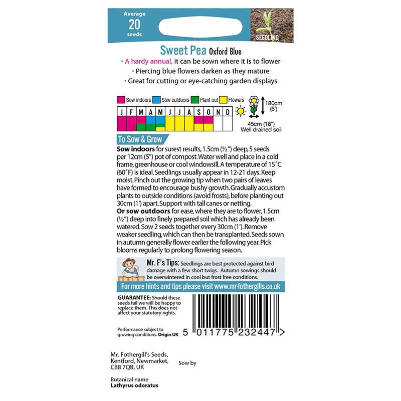Vetenskapligt namn: Lathyrus odoratus 'Oxford Blue'Såtid: mars-maj