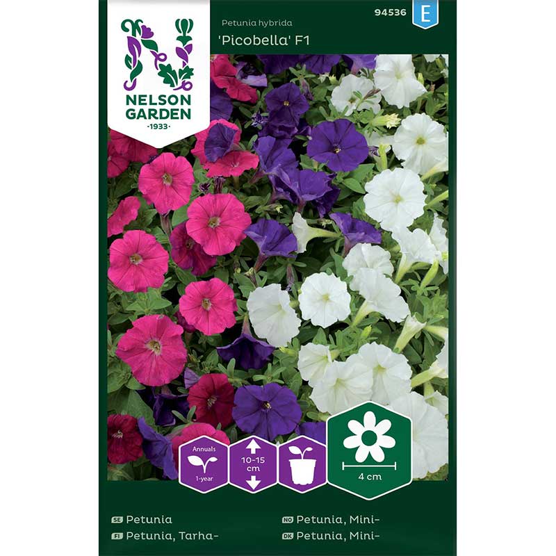Liten rikblommande petunia med ett kompakt växtsätt i blandade, intensiva färger. Plantan är en dvärgsort som ger rikligt med blommor. Lämplig både i rabatter, balkonglådor och amplar. Trivs i lucker plantjord och regelbunden näring.