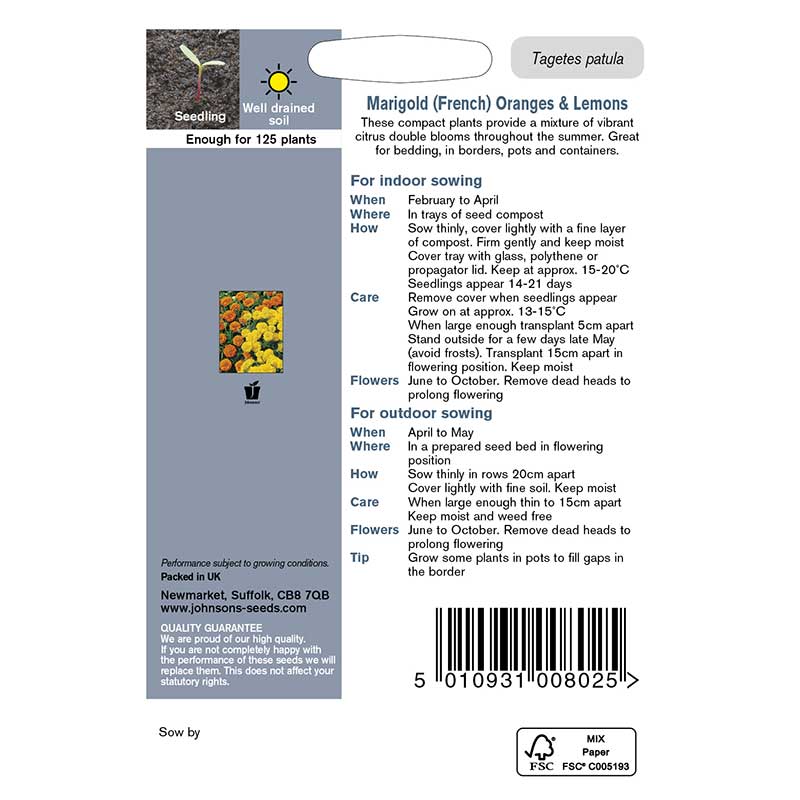 Tagetes har fått en välförtjänt renässans och hör till våra mest användbara och lättodlade sommarblommor. 'Orange & Lemons' är en perfekt sortblandning med fyllda orange och smörgula blommor. Denna härliga och färgstarka växt ger varm blomning hela sommaren och fram till frosten. Nyp bort vissna blommor så lockas nya blomknoppar fram.