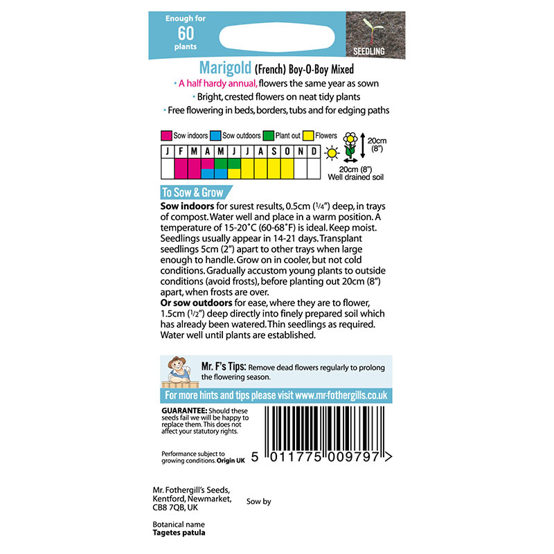 Vetenskapligt namn: Tagetes erecta 'Boy-O-Boy Mixed'Såtid: mars-maj