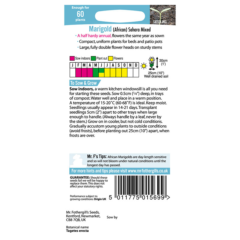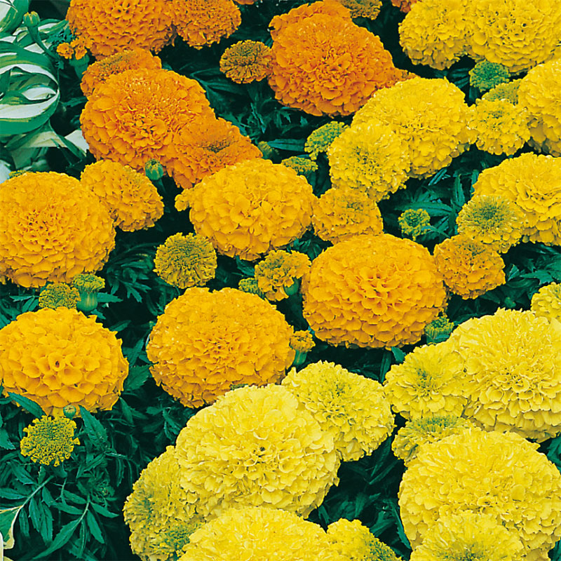 Vetenskapligt namn: Tagetes erecta 'Sahara Mixed'Såtid: mars-maj