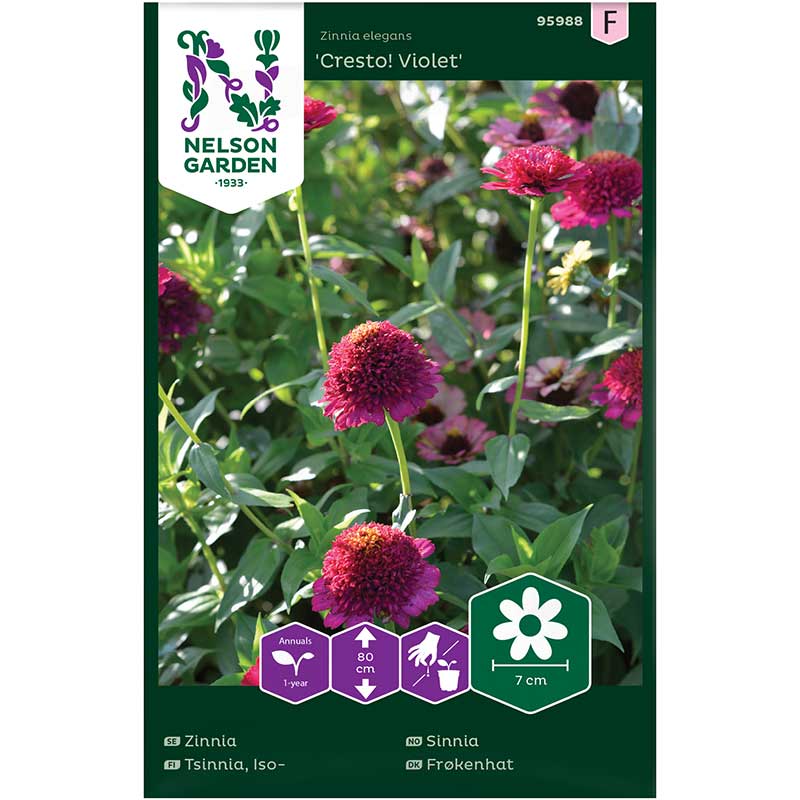 Vacker fylld zinnia i mörkt violett färg. Enstaka blommor blir enkla. Lättodlad och tacksam. Plocka bort vissna blommor efter hand så blommar den hela sommaren. Utmärkt snittblomma. Trivs i näringsrik, lucker plantjord. Vattna vid torka.