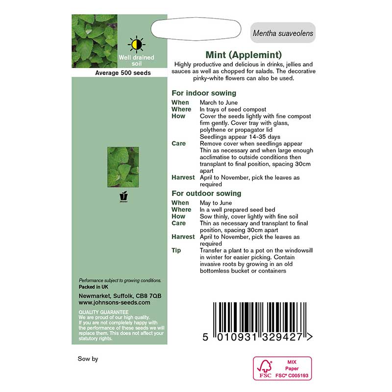 Såråd: Så inomhus, grunt (ca 0,3 cm) i fuktad såjord. Täck med huva eller plast för ökad luftfuktighet. Fröna gror i rumstemperatur efter 2-3 veckor. Ställ därefter groddplantorna ljust och svalt för kompakt växtform. Toppa gärna plantorna för buskigare växtsätt. Avhärda före utsättning och plantera med ca 30 cm avstånd. Kan också sås utomhus under vår och sommar; antingen direkt på växtplatsen eller förodlas i krukor. Äppelmynta fungerar också att odla året om i hydrokultur.