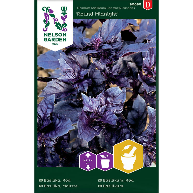 Aromatiskt doftande basilika med dekorativa, stora, mörkt röda blad. Delikat i olika maträtter och fin som dekoration.
