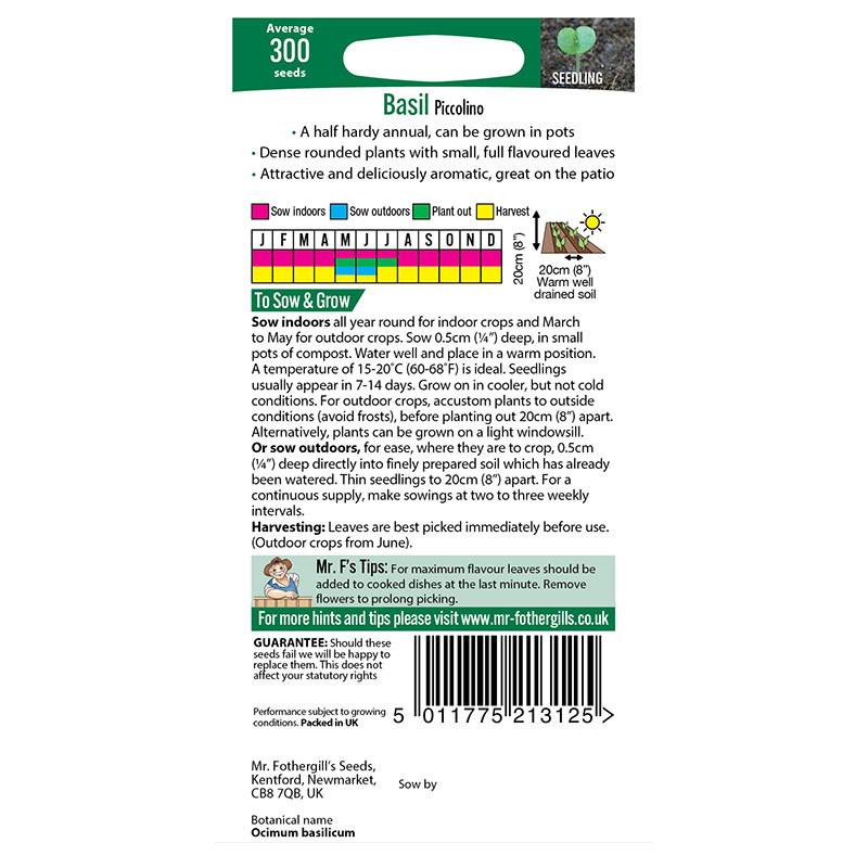 Mycket dekorativ kuddväxande sort. Små blad som har en fyllig, välutvecklad basilikasmak. Perfekt sort att odla i kruka i fönsterkarmen.