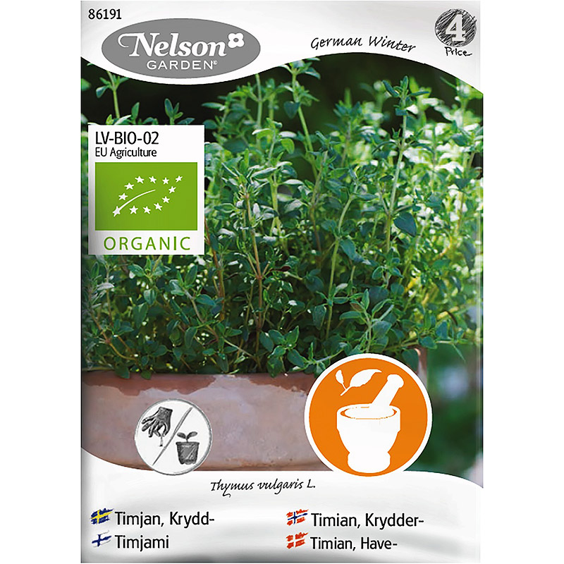 Kryddtimjan är en lättodlad och vintergrön kryddväxt med aromatiska blad. De vackert rosalila blommorna lockar till sig bin. Bladen skördas efter hand och används färska eller torkade. Förodling: Så glest i fuktad såjord, ställ i rumstemp. Efter uppkomst, ljust och svalt. Omplantera till ett par plantor/kruka. Utplantera efter frost.