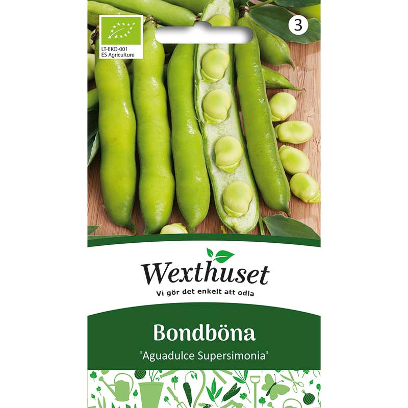 Lättodlad bondböna som ger 35 cm långa baljor med stora, plattrunda bönor. Bondbönor är extremt proteinrika och kan avnjutas färska eller tillagade. De kan också få hänga kvar på plantan och torka in för att lagras hela vintern.