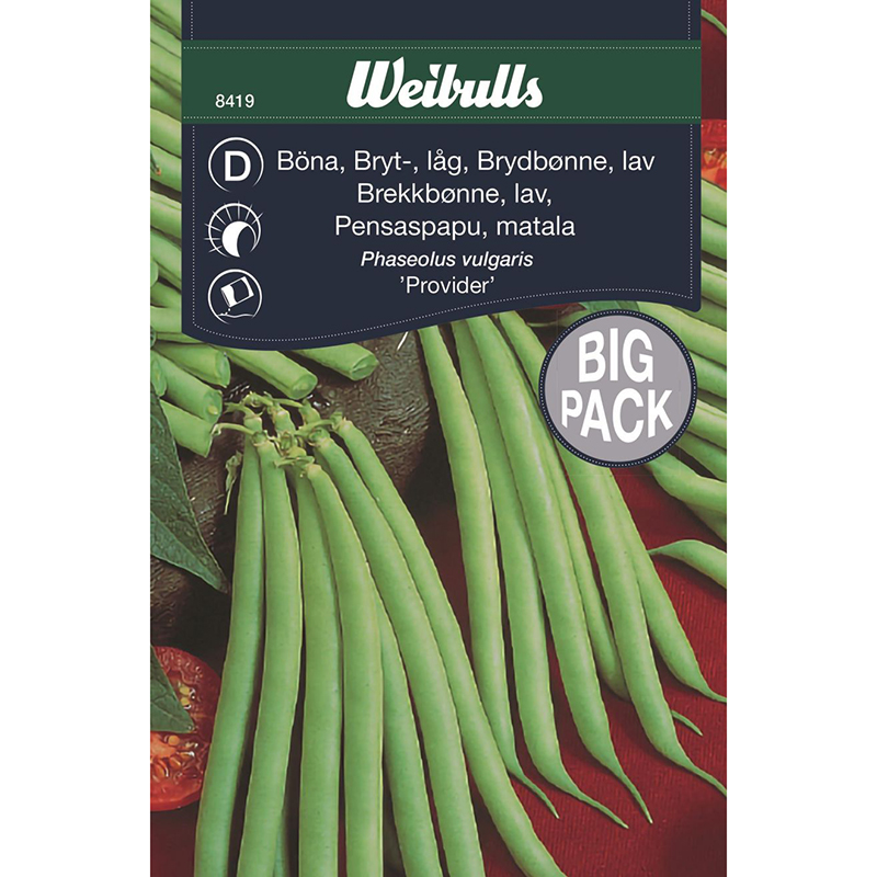 Odling: Så direkt på växtplatsen i maj-juni då jordtemperaturen överstiger 10 grader. Mylla fröt 2-3 cm djupt. Blötlägg eventuellt fröt före sådd för att underlätta groningen. Gror efter 7-10 dagar. Ofta har jorden torkat upp rätt mycket, när det är dags för bönsådd. Vattna rejält. Skörda efter hand som baljorna växer till, så blir skörden jämn och ihållande.