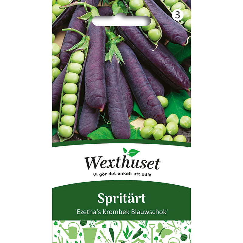 En tidig, bördig sort med vackra, mörka baljor och illgröna ärter. Spritärter är en delikatess färska. Frys in överskottet lätt förvälllda. Skörda när baljorna är fullt utvecklade. Eller driv fram läckra, nyttiga och krispiga ärtskott inne året om.