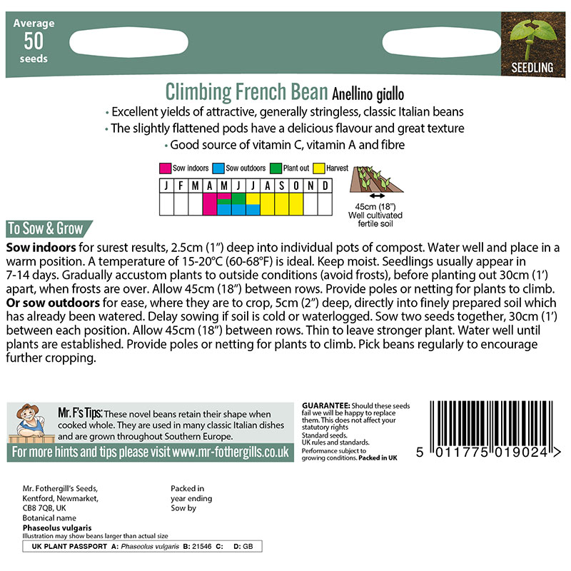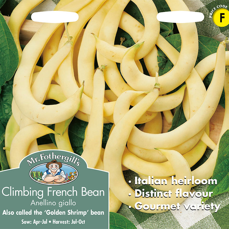 Gul, böjd gourmetböna med härlig textur och mycket god smak utan trådar. Skörda efter hand, flera gånger i veckan. Goda att koka och därefter ätas tillsammans med salt och smör. Kräver växtstöd.