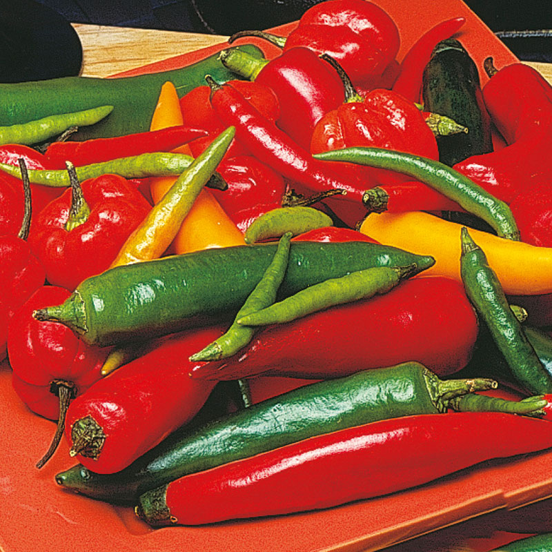 Blandade färger, former och storlekar med olika hetta från mild till brännande hett för användning i många olika maträtter