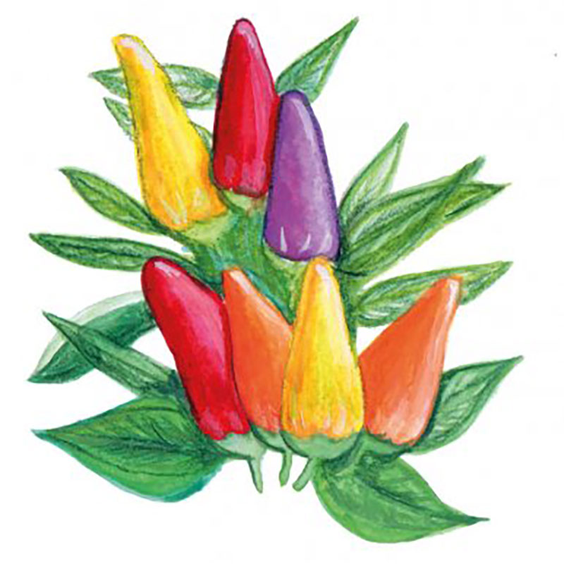 Uppseendeväckande vacker planta med grön-lila blad och frukter i alla färger som växer upp och ner ovanför bladverket. Mognar från gul-lila-orange till röd, alla färger finns samtidigt på plantan. Kompakt, ca 40 cm hög som fungerar bra i kruka. Detta är din nya krukväxt för köksfönstret! Vackrare mat är svårt att hitta…