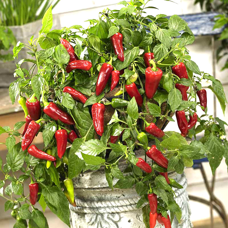 En fantastisk sort att odla är denna hängade paprika med stora lysande röda frukter.