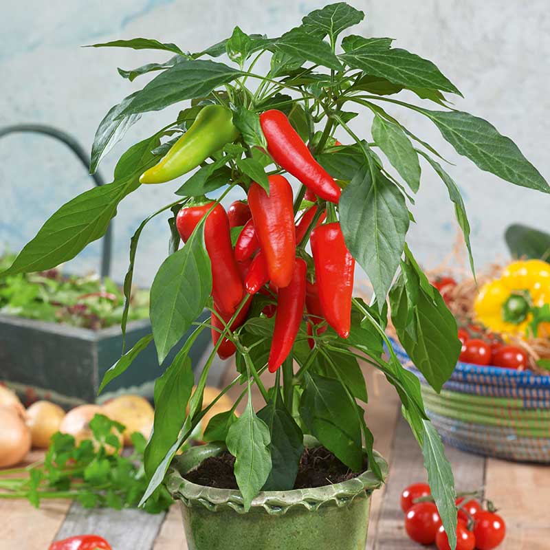Läckra, små röda parikor av så kallad snacks-typ. Söta och krispiga. Plantan blir inte så hög (ca 40 cm), perfekt för balkong och terrass i ett varmt läge.