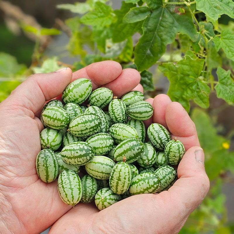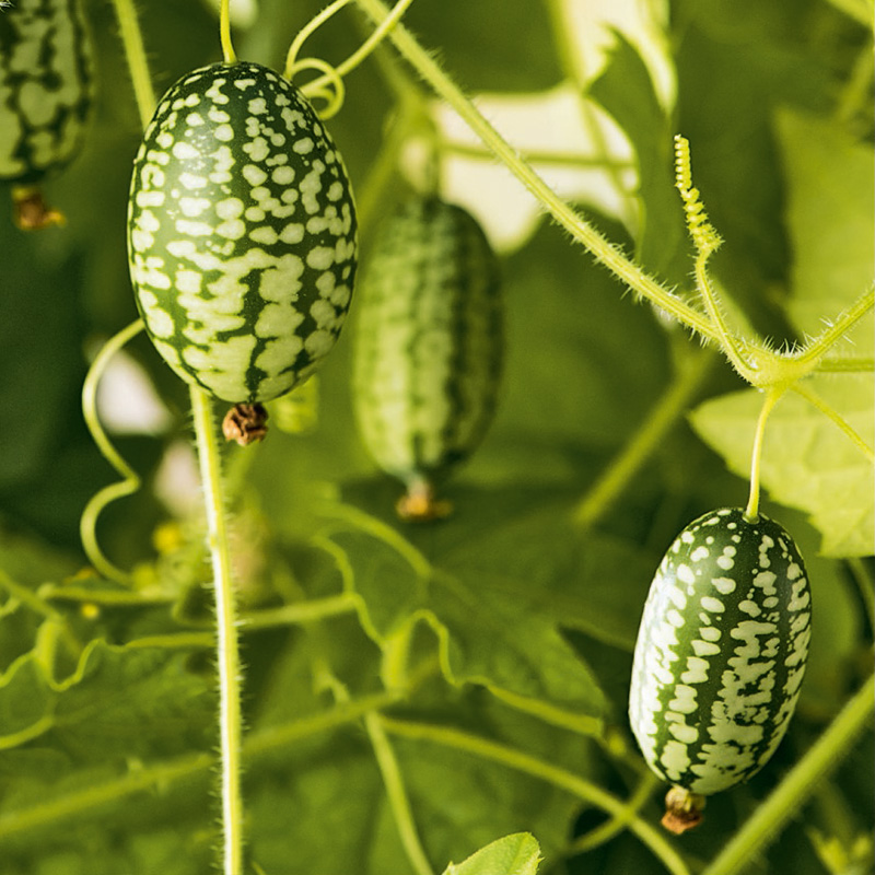 Kallas också cucamelon och Mexikansk vattenmelon. Smakrik, krispig med fräsch citrussmak. Översållas av 4 cm vackra frukter, äts färska eller inlagda som syltlök. Lättodlad i kruka ute på varm plats och inne (gärna med växtlampa). Även i hydrokultur.