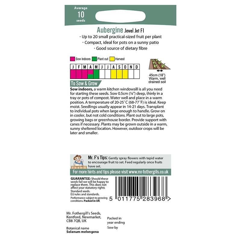Kompaktväxande aubergin som ger ca 20 frukter på varje planta. Perfekt för kruka eller pallkrage på varm, skyddad plats. Också lämplig för odling i uterum eller växthus. Aubergin är en härlig grönsaksfrukt att grilla, gratinera, till grönsaksröror eller ugnsstekt.