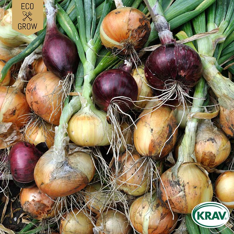 Lök Mix Color Mix - är en härlig blandning av flera löksorter i olika färger och former. Varierar från plattrunda gula lökar med brunt skal, runda söta röda lökar med ett bronsrött yttre till helvita silverlökar med mild och mjäll smak. Samtliga sorter passar utmärkt för färskkonsumtion men är även lagringsdugliga. Denna mix innehåller rödlök, gul lök och silverlök.