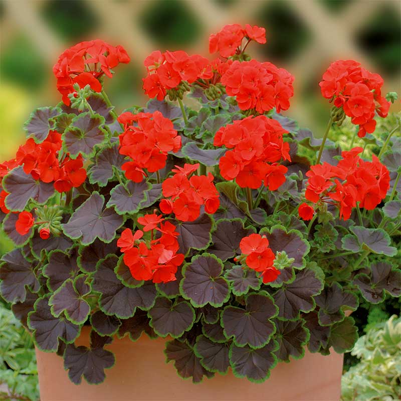 En härligt rikblommande sort med blad som nästan helt täcks av chokladbrunt. Endast den yttersta kanten är grön vilket ger den en extra intressant kontrast mot den lysande färgen på blomman.