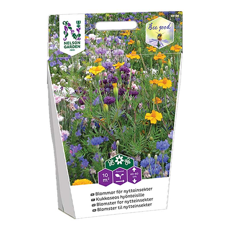 En mix av ett- och fleråriga arter som älskas av insekter. Intill frukt- och grönsaksodlingar ger de skydd och skafferi åt pollinatörer och insekter som motverkar skadegörare. Blanda gärna fröna med sand eller liknande. Då blir det enklare att så. Så under april-nov. Så på våren om du vill ha blomning till sommaren. Så på hösten för blomning följande år. Sprid fröna jämnt, tryck till jorden och håll såytan fuktig efter sådd. Klipp ner efter blomningen. Låt klippet fröa av sig och ta sedan bort det.