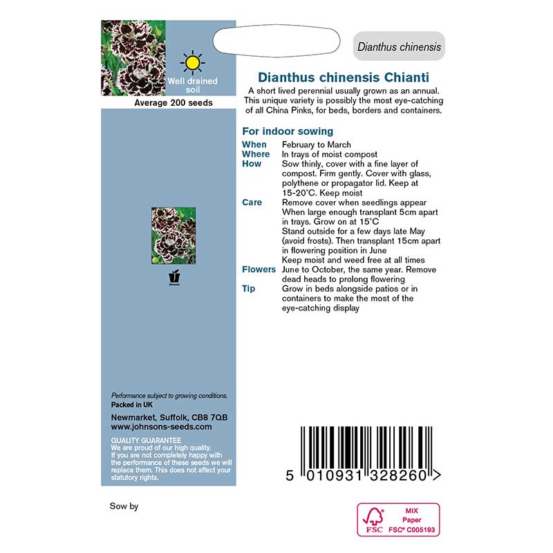 Vetenskapligt namn: Dianthus chinensis Heddewigii-gruppen 'Black and White Chianti'Såtid: feb-april