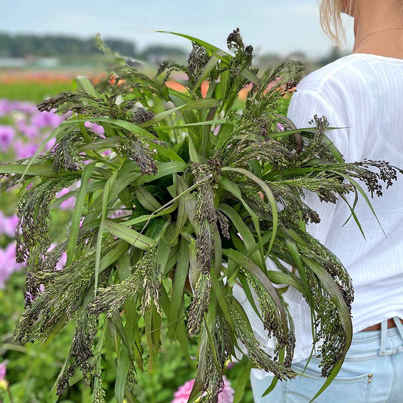 En prydnadsgräs med breda gröna blad och kraftigt växtsätt. Hängande gröna ax som mörknar till violett. Fina till snitt.