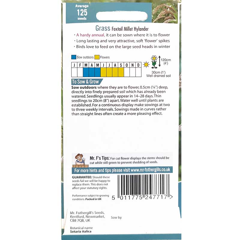 Odlingsråd: Så direkt på växtplatsen när jorden är brukbar. Rensa först från ogräs och vattna igenom jorden ordentligt. Gallra eventuellt efter några veckor om groddplantorna står för tätt och plantera om dem glesare. Håll jorden lätt fuktig under groningstiden. Eller förodla inomhus, så i såjord i brätten. Fröna gror vid 15-20 grader, håll fuktigt under groningstiden. Plantera ut när frostrisken är över.Vetenskapligt namn: Setaria italica var. longiseta 'Hylander'