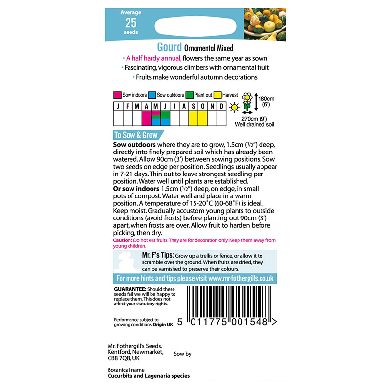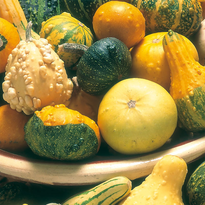 En rolig mix av spännande prydnadsfrukter. Flaskkurbits, eller kalebass, är en härlig slingerväxt som ger dekorativa frukter. Plantan slingrar sig snabbt mot en vägg eller spaljé i soligt läge. Frukterna plockas av på hösten och hängs upp att torka. Också prydnadspumporna behöver klättra för att komma till sin rätt. I Faktabanken hittar du massor av råd om odling och användning av dessa spännande växter.