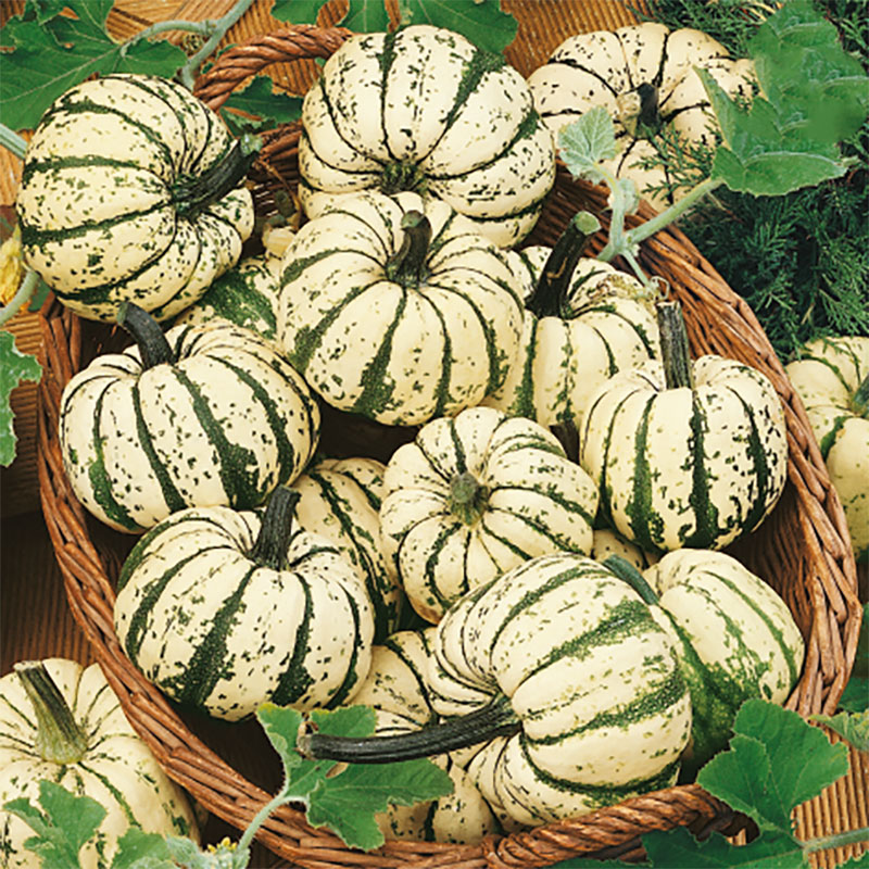 En smakrik pumpa som skördas 10 cm stora. Skalet är ljust med dekorativa gröna ränder. Orange fruktkött med angenäm söt smak. Passar bra till klassisk pumpapaj likväl som i soppa och i bröd. God också att ungsbaka och grilla. Tål lagring väl.