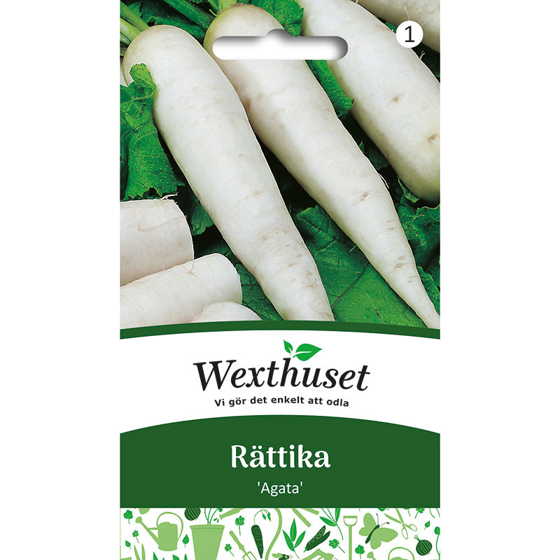 Långa, slanka rättikor med krispigt fruktkött. Mild rädissmak, härlig i sallad eller wokad. Tål att lagras över vintern. Ger tidig skörd, 50-60 dagar efter sådd. Kan drivas som krispiga, nyttiga rättiksskott inne året om.