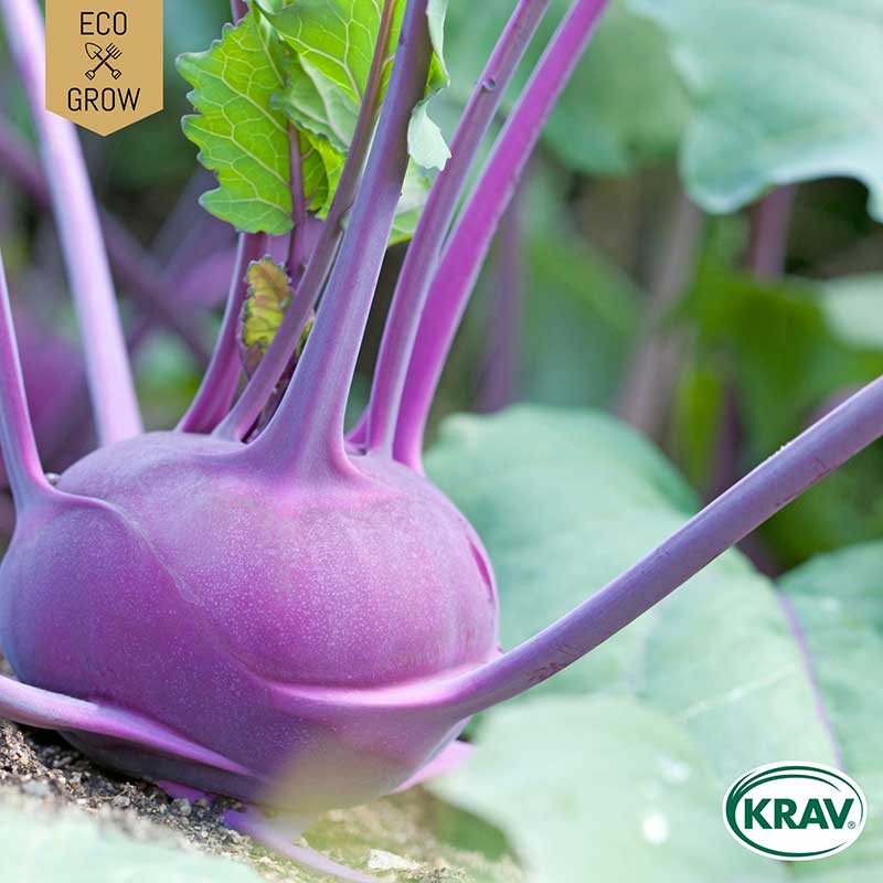 Kålrabbi 'Delikatess Blauer' - är en utsökt snabbväxande knöl med ett krispigt vitt fruktkött och ett violett yttre. Skördas vid en storlek på 5-10 cm innan den blir trådig. Har en mild, nötig smak som påminner om en blandning av kål och mild rädisa. God att ätas rå, ugnsbakad eller i wok. Även de mindre bladen är goda och kan ätas råa eller tillagade. Mycket vitaminrik.