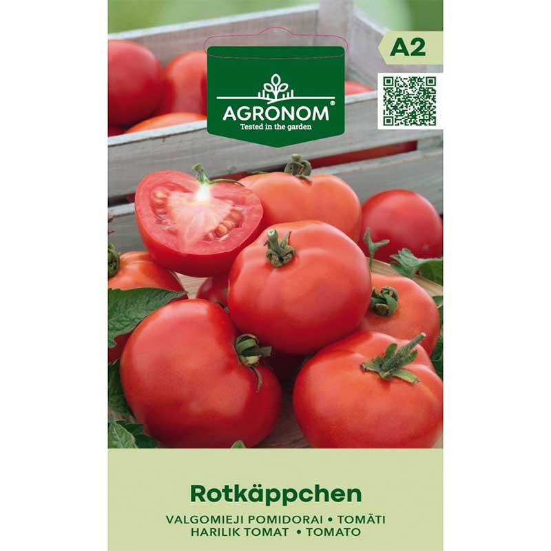 Busktomat 'Rotkäppchen' - är en högavkastande busktomat som ger riklig skörd av röda, saftiga medelstora körsbärstomater på ca 20 gram Den buskiga plantan blir inte högre än 50 cm så passar utmärkt för krukodling på balkong eller altan. Skotten i bladvecken, "tjuvarna", tas ej bort.