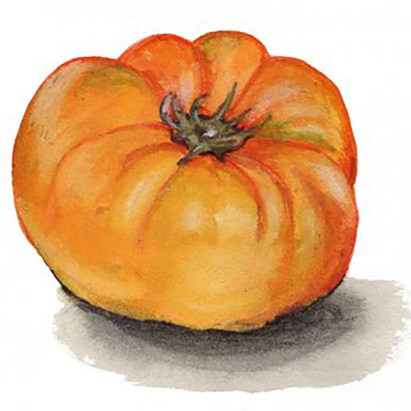 En stor och vacker bifftomat, gul med anstrykningar av rött. Mycket vacker även uppskuren.