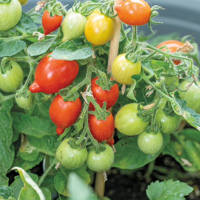 De eleganta blommorna reser sig som små paraplyer ovanför bladverket, och när tomaterna mognar bildar de ett vackert rött täcke över plantan. 'Funnyplums Red' F1 är enkel att sköta, då den inte kräver växtstöd eller tjuvning.