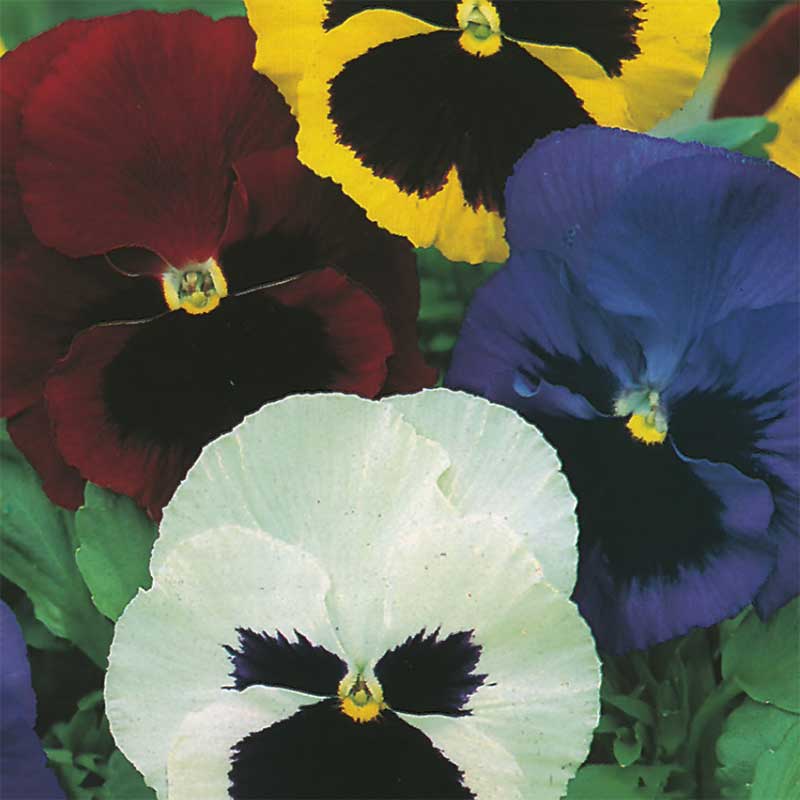 En mix av pensé som strålar med färgstarka, stora blommor.