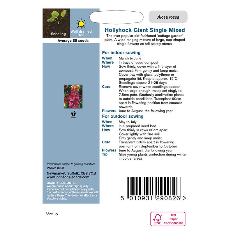 Stockrosor hör till våra mest älskade torpväxter med en blomrik, romantisk karaktär. 'Giant Single Mixed' ger en trevlig färgblandning av stora blommor på höga spiror. Kommer bäst till sin rätt mot plank, husväggar eller bakerst i rabatten i ett soligt läge. Låt spirorna stå kvar under sensommaren/hösten så självsår sig plantan. Stockrosor är två-åriga och blommar andra året efter sådd, rensa inte bort den lilla ett-årsplantan!