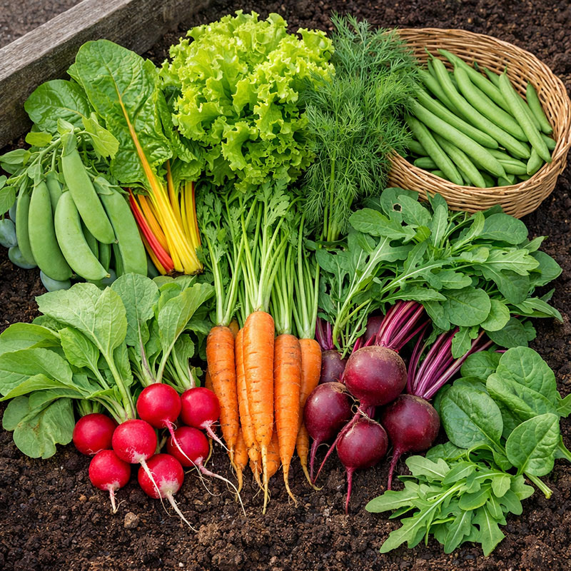 Sorterna är utvalda för att komplettera varandra, både i växtsätt och skördetid. Du får en bra blandning av snabba grödor som rädisor och rucola, tillsammans med sorter som ger skörd längre fram som morot, rödbeta, bönor och mangold.