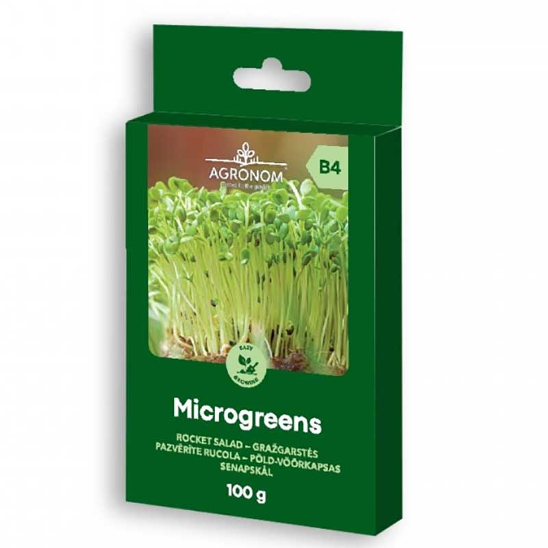 Frön av ruccola för mikrogrönt med mild, lätt pepprig smak. Kan odlas året runt inomhus, antingen i fönster eller under växtbelysning. Sås tätt för att bilda en grön matta.