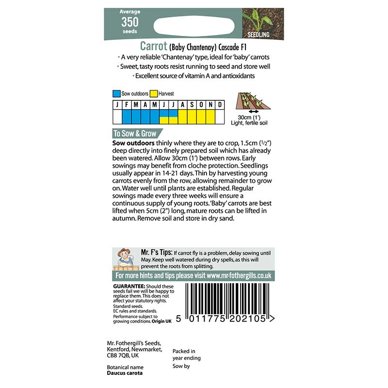 Snabbväxande sort som bäst skördas som babymorötter. Krispiga och söta. Täckodling med gräsklipp och växtrens ger den bästa odlingsmiljön.