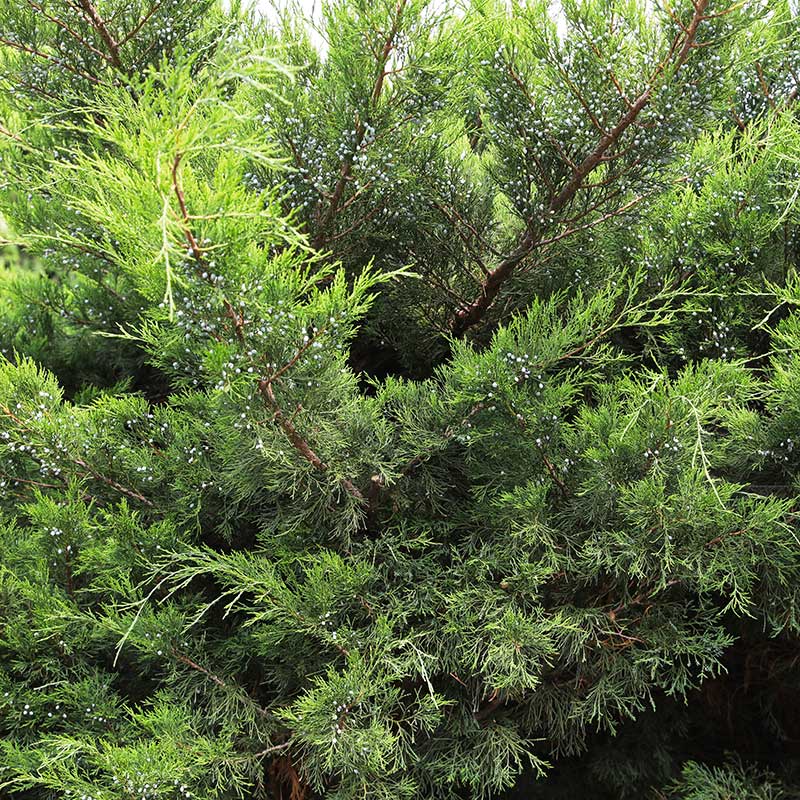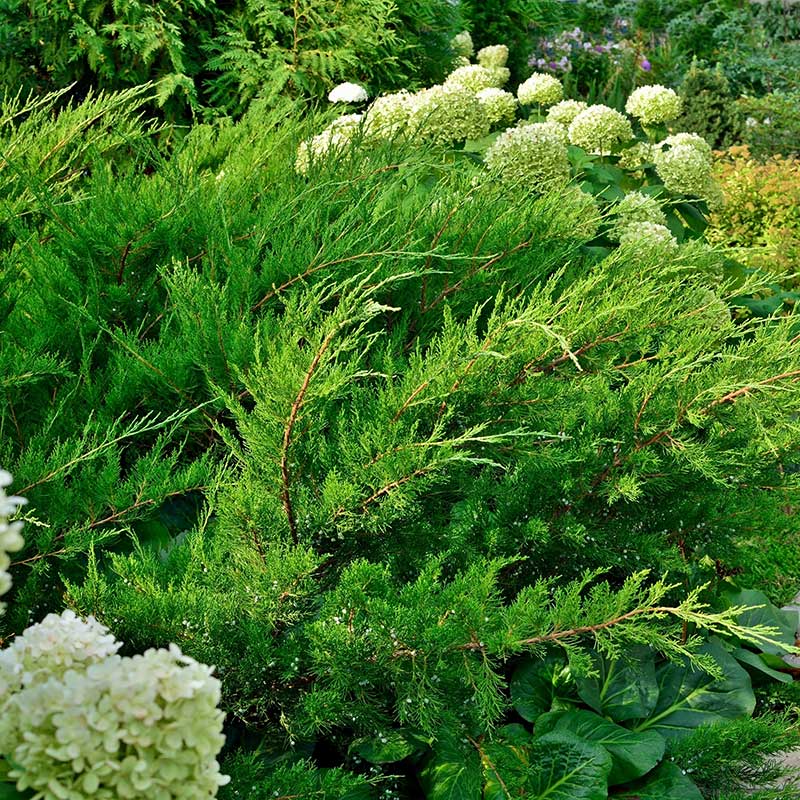 Juniperus x pfitzeriana ‘Mint Julep’, även kallad trädgårds-en, är en vacker och robust barrväxt med ett brett, buskigt växtsätt och mjukt bågböjda grenar med hängande skottspetsar som ger ett elegant, fontänlikt utseende.