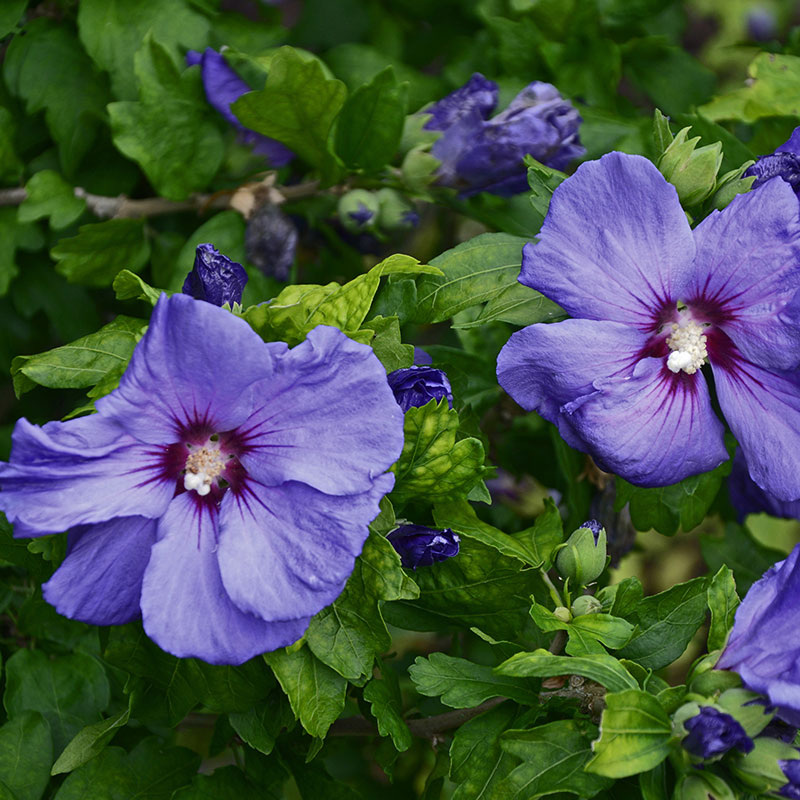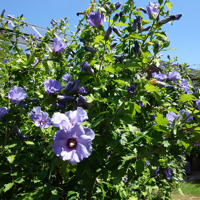 Hibiscus syriacus ‘Marina’ är en elegant och långblommande prydnadsbuske som ger trädgården en exotisk känsla under sensommaren. Sorten kännetecknas av sina stora, öppna blommor i djup blåviolett nyans med ett tydligt mörkrött öga i mitten, vilket skapar en stark kontrast och ett mycket dekorativt uttryck. Blomningen är riklig och pågår från juli till september, en period då många andra buskar redan har blommat färdigt. ‘Marina’ växer upprätt och välförgrenat till en höjd på cirka 2–3 meter och lämpar sig utmärkt både som solitär, i buskage eller som friväxande häck. Bladverket är friskt grönt och ger en lugn bakgrund till de färgstarka blommorna. Busken är lövfällande och spricker relativt sent på våren, vilket gör den mindre känslig för sena frostnätter. Hibiscus syriacus ‘Marina’ trivs bäst i soliga, varma lägen och i väldränerad, näringsrik jord. Den är tålig när den väl har etablerat sig och klarar både torka och stadsmiljöer förhållandevis bra. I Sverige är den härdig upp till zon 1–2, och i skyddade lägen kan den även odlas i högre zoner. Unga plantor bör vinterskyddas de första åren, särskilt i utsatta eller kallare lägen. Täck rotzonen med löv, bark eller granris för att skydda mot tjäle, och undvik platser med kalla vintervindar. Beskärning görs vid behov tidigt på våren och stimulerar ny tillväxt och rik blomning.