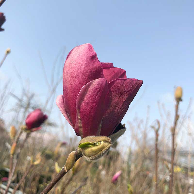 Magnolia 'Genie' är ett ny korsning mellan magnolia soulangeana och magnolia liliiflora 'Nigra'. Sorten är lättodlad och har kompakt och upprätt växtsätt. Magnolia 'Genie' blommar med underbart vinröda tulpanformade blommor. Sorten har senare blomning som minskar risken för frostskador. Kan blomma med hundratals blommor på bar kvist.