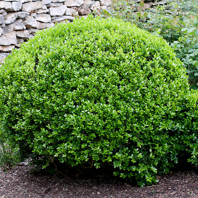 Detta är en redan formklippt planta av buxbom 'Faulkner'. Sorten är vintergrön med rundat växtsätt.