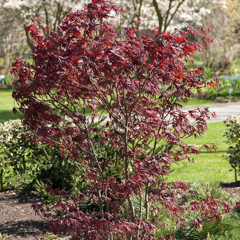 Som solitär växt kommer Acer palmatum 'Bloodgood' verkligen till sin rätt i trädgården. Dess dramatisk röda bladverk ger året-runt-intresse och fungerar som en utmärkt fokuspunkt i designen.