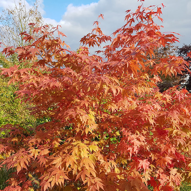 Acer palmatum 'Osakazuki' är en vacker japansk lönn som utmärker sig för sina intensiva färgskiftningar under året, vilket gör den till ett fantastiskt solitärträd. Med sin eleganta, upprätta växtsätt och vackra blad är 'Osakazuki' en idealisk växt för att skapa en stilfull och färgglad accentpunkt i trädgården. 'Osakazuki' är mest känd för sina dramatiska höstfärger. Under våren och sommaren har den ljust gröna, handflikiga blad som ger en mjuk och fräsch känsla. När hösten kommer, exploderar trädet i en fantastisk färgpalett av röd, orange och gula nyanser, vilket gör att det verkligen sticker ut som en höjdpunkt i trädgården. Buskträdet har ett upprätt, graciöst växtsätt och en rundad form.