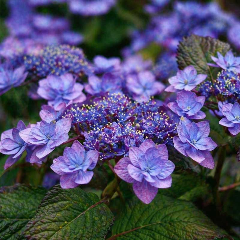 'Blue Clouds' är precis vad den heter – ett svävande, ljust moln av skira blommor. Denna art är ofta något mer tålig och nättare än den vanliga trädgårdshortensian. Detta är en så kallad ""Lacecap""-hortensia (tallrikshortensia), vilket innebär att den har en platt blomställning med små fertila blommor i mitten och större, dekorativa sterila blommor som en krans runt kanten. Det ger ett mycket lättare och mer naturligt intryck.